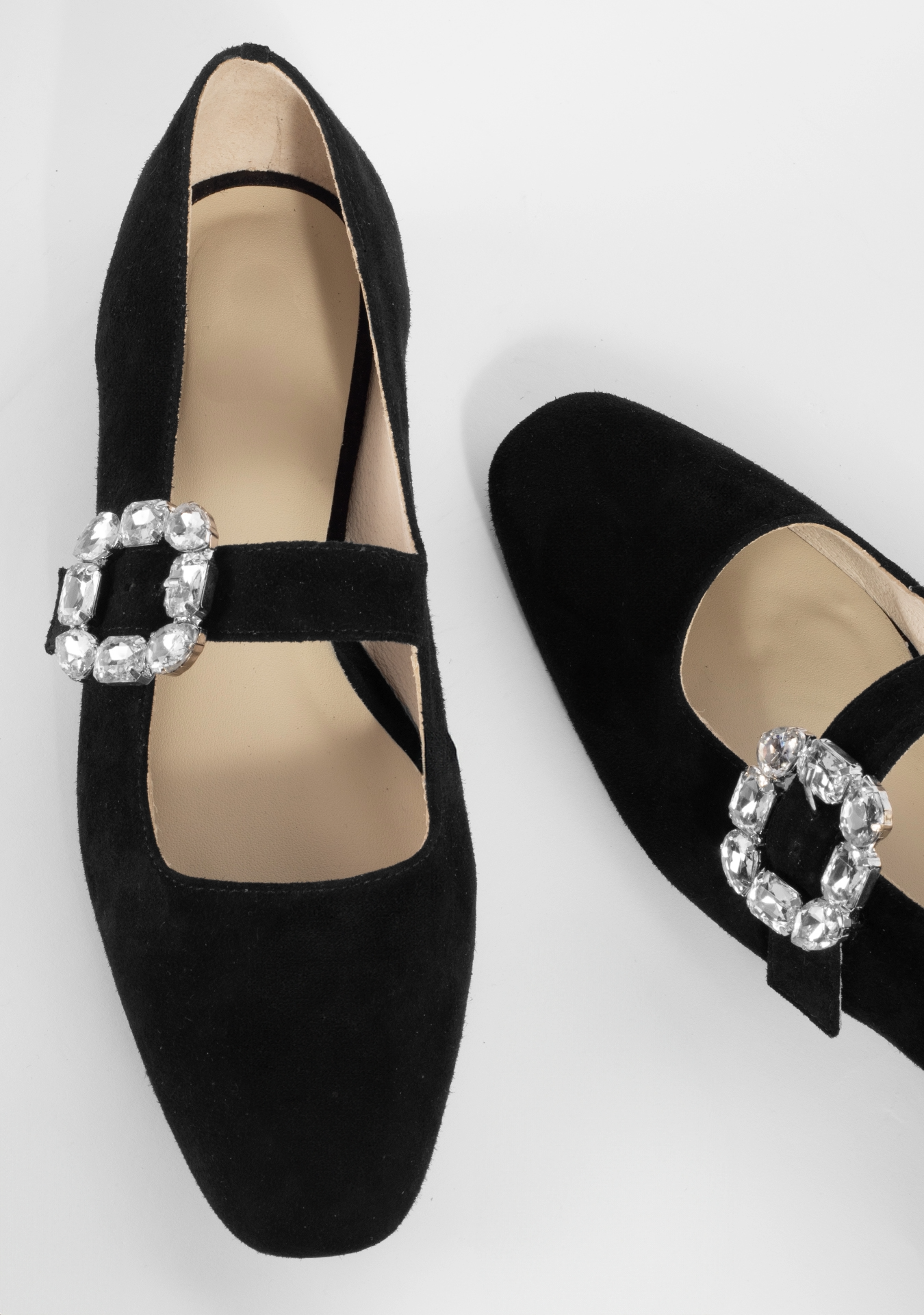 Polyvalentes par nature, les ballerines en cuir suédé noir à bride ornée d’une boucle bijou se portent dans de multiples contextes.